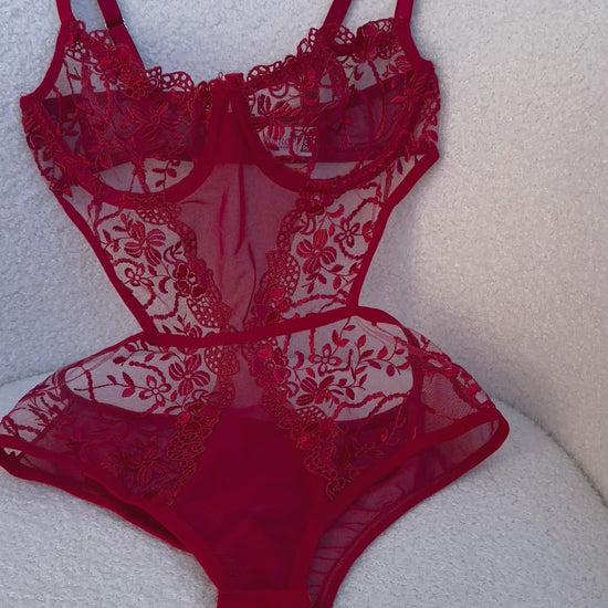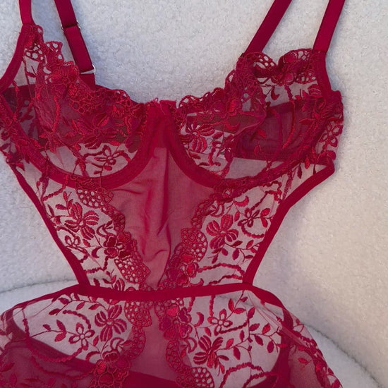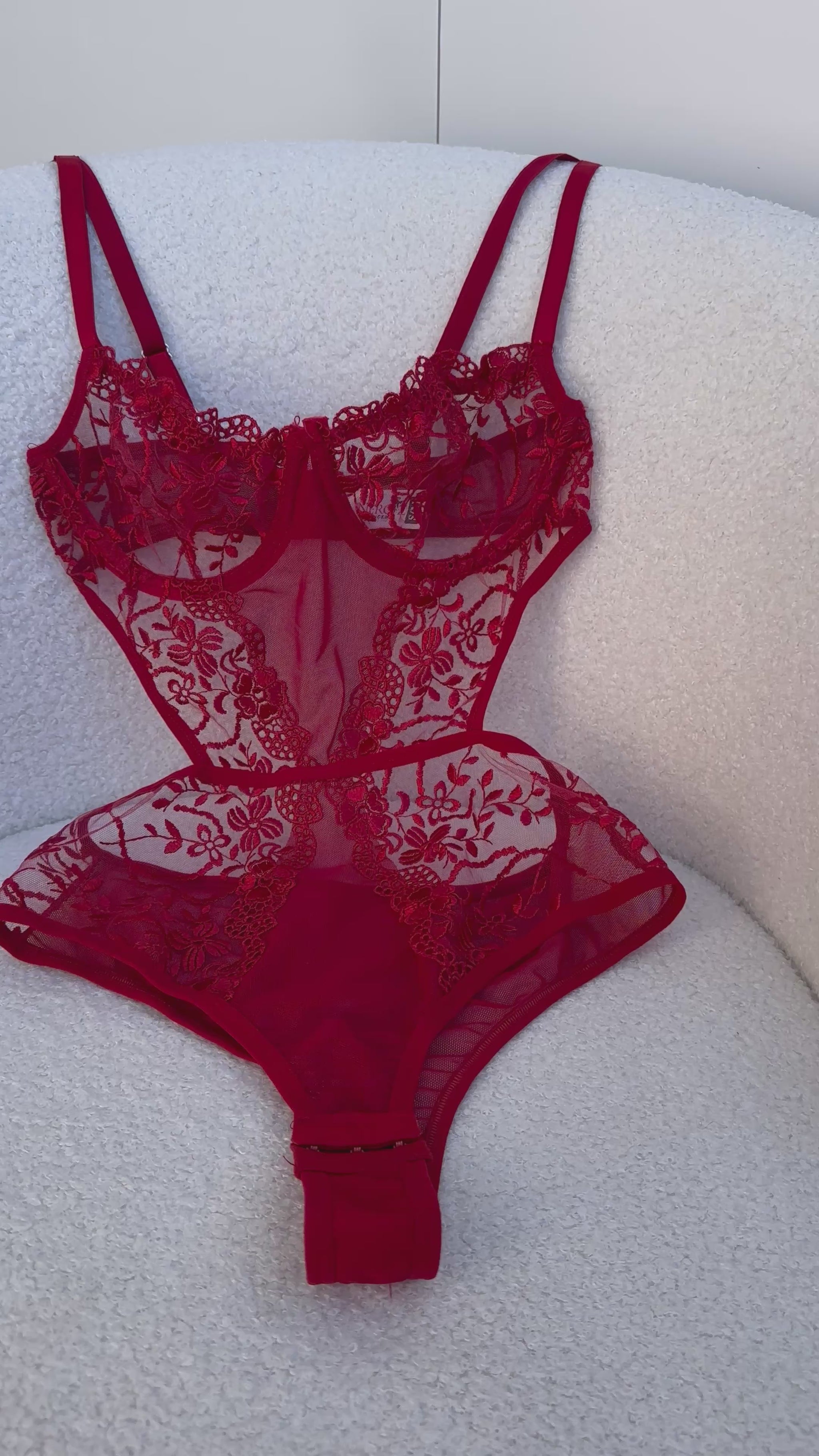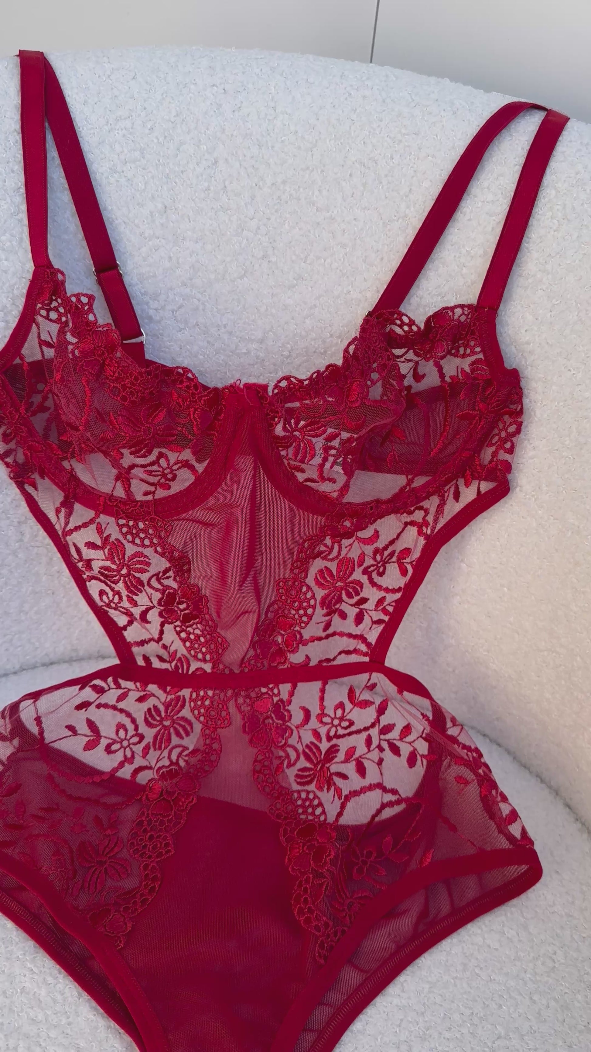 Designed in a rich scarlet hue, this piece features intricate floral lace that embraces your curves with sheer elegance.